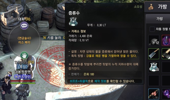 거래소에서 증류수 20개를 구입합니다.