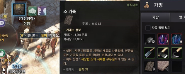 아마포는 현재 거래소에 매물 많음 / 소 가죽은 돌꼬리 목장 위쪽에 돌머리 소한테 얻을 수 있습니다.