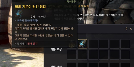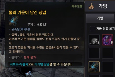 장갑에 속성을 부여하기 위해 깨끗한 증류스가 필요하다고 합니다.
